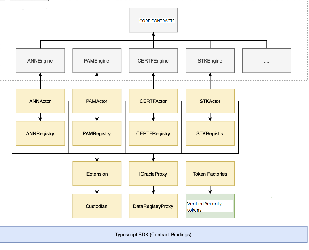 A subset of the contracts, the Product Engines such as ANN engine for an annuity bond implement the contract for the product. Its main features are creation of asset schedules from contract terms and computing state progression. The remaining contracts facilitate asset registration, connection to external data (oracles), tokenization and other aspects related to the lifecycle of an asset on Ethereum.