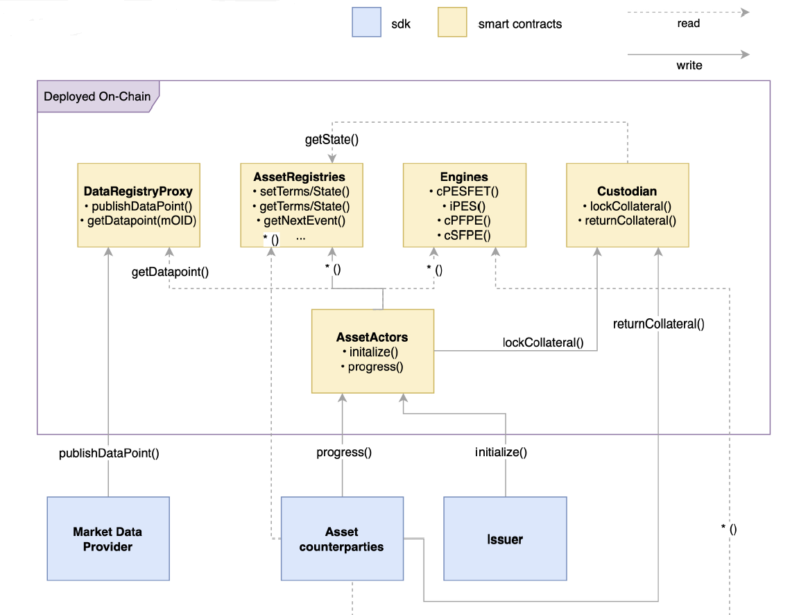 When issuing an asset, a transaction calls the initialize method of the Asset Actor containing the asset terms, ownership information and the address of a Product engine . The exact parameters vary slightly between the contract types. Progressing through the lifecycle of the asset is done via the progress method of the Asset Actor . It retrieves the terms and the current state of the asset from the Asset Registry and uses the Product engines to derive the requirements for the state transition of the asset. For example if a payment is necessary to progress the asset's state, it is executed by the Asset Actor (assuming allowances were set at time of execution). Market Data Providers are whitelisted Ethereum accounts, e.g. decentralized oracles or trusted third parties that can publish data to the Data Registry using the publishDataPoint method. They provide external data points needed for example for rate resets, determining the market value of underlying assets.